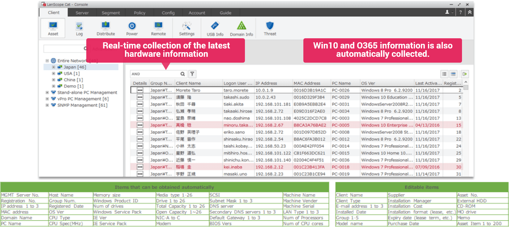 Automatically obtains over 50 types of hardware information such as computer name, IP addresses, printers and other peripheral devices. This gives a visualization of vulnerabilities that can provide an easier decision for countermeasures.