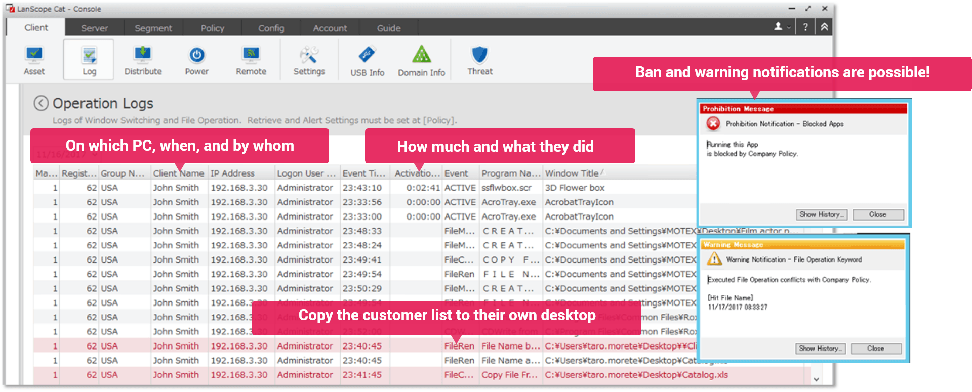 Collects the history of operations performed by the company staff, and warns users if there are any violations. It can also collect logs at the beginning and end of the day as information to grasp