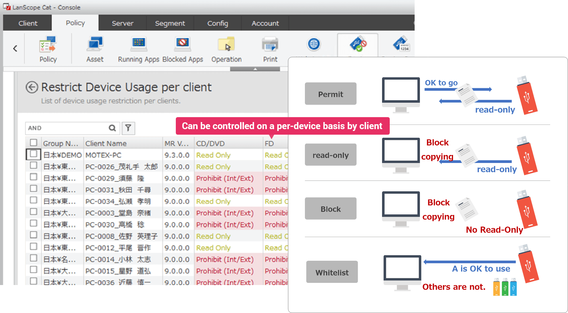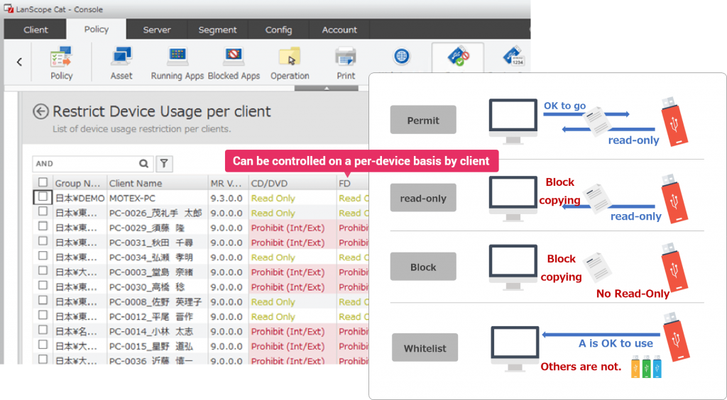 Prevent information leaks by controlling the use of devices such as USB flash drives and smart devices.